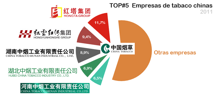 Por lo que estas cifras estratosféricas marcan la fortaleza de la industria china del tabaco y el gran mercado que supone China, donde el 43,5% de todos los cigarrillos vendidos en sus fronteras son producidos por cinco principales empresas que se muestran en el siguiente gráfico: