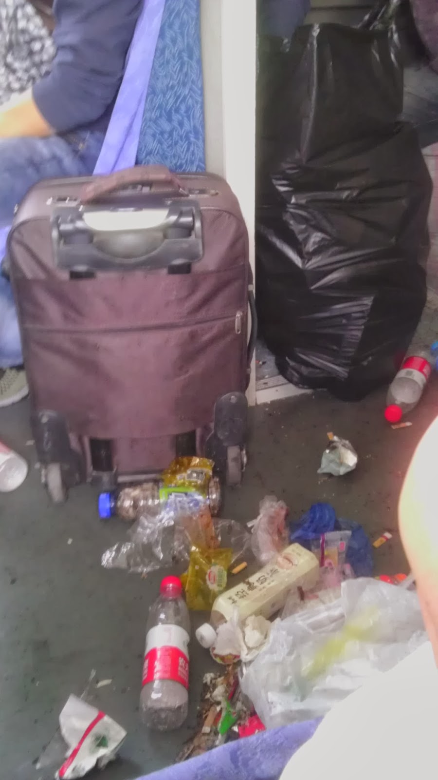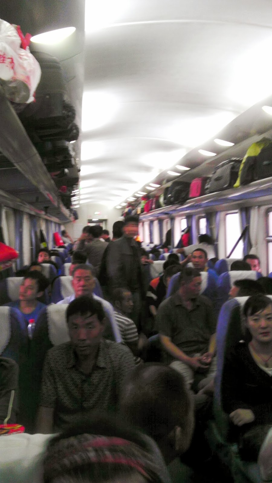 Total, que hicimos cola un buen rato, ya que nuestro tren llegó con un poco de retraso (venía de no-sé-qué otro sitio) hasta que por fin pudimos pasar al andén y anadear por el mismo hasta dar con nuestro vagón. Al entrar en el vagón, nuestras dudas acerca de la procedencia del tren se disiparon automáticamente: venía del Inframundo, sin más. Nos dimos de bruces con toda la gañanada de rústicos del Norte: con sus sacos de tela y sus fundas de almohada cargadas de cosas, sus bolsas de plástico a rebosar de «tallarines convenientes» (fangbian mian 方便面, que es como se llaman los tallarines esos que solo precisan un poco de agua caliente y listo), sus botellas llenas de –dios lo quiera– agua y sus uñas llenas de tierra.