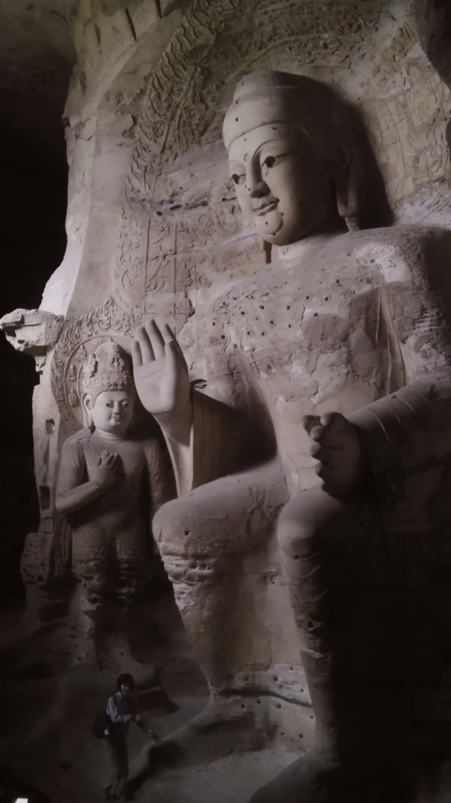 A la mañana siguiente, nuestro autocar nos llevó a las grutas, al norte de las montañas de Wuzhou. Estas cavernas (unas 52 hasta la fecha) se extienden a lo largo de 1 km, de Este a Oeste, y cuentan aproximadamente con 51000 estatuas talladas en las paredes, de dimensiones muy diversas. Originalmente todas ellas se encontraban pintadas y decoradas, pero el contacto con el oxígeno y los agentes ambientales han provocado su decoloración; no obstante, todavía pueden observarse las decoraciones en algunas de las grutas (por las que hay que pagar más, claro está). Además de las grutas, el complejo cuenta con unos jardines en los que templos y pagodas se hallan diseminados, y a ciertas horas del día se realiza un espectáculo que recrea la ceremonia imperial de saludo y ofrenda del Emperador al Buda de Yungang. Es una visita que merece mucho, mucho la pena, a pesar de lo impresionantemente aburrido que es Datong en sí.