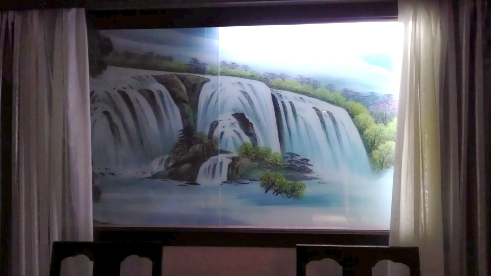 ¡Sí, amigos! ¡La ventana de la habitación era un puto cuadro luminoso de una cascada! Lo típico.