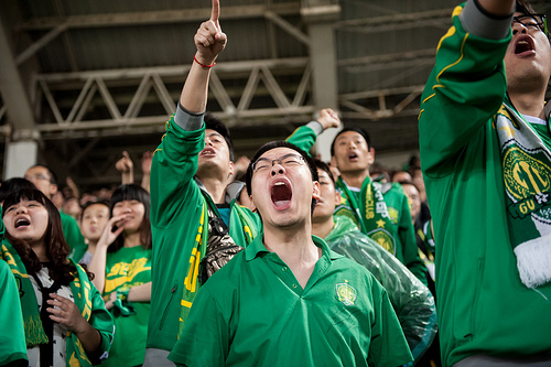 Gregorio Manzano, ex entrenador del Guoan y actual entrenador del Shanghai Shenhua, comparó en su blog la afición del equipo pekinés a la de los “Reds” de Liverpool y en una conferencia en el Instituto Cervantes llegó a mencionar que “La afición del Guoan es espectacular, uno tiene que ir al campo para saber lo que es.” A medida que transcurre el partido comprobamos que no le faltaba razón. La pasión y el optimismo de los fans del Guoan es inagotable. El primer gol del equipo contrario llega en el minuto 45 pero los cánticos no cesan en ningún momento. Mientras tanto la riqueza del lenguaje se hace visible y se van escuchando insultos de lo más variopinto. Shabi, término que podría traducirse por nuestro tan socorrido gilipollas, es sin duda el más popular y repetido en las gradas verdigualdas. El segundo tanto llega tras el descanso, en el minuto 51. Sin embargo los aficionados no se vienen abajo y animan, cantan y gritan hasta que suena el pitido final.