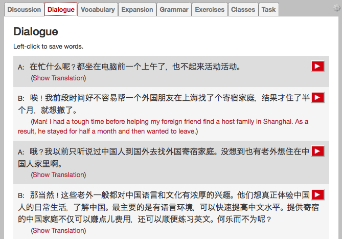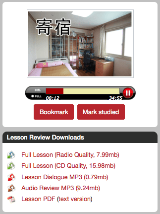 «Full lesson» es la clase normal que suena cuando le das al play en el reproductor de audio de debajo de la foto. La clase empieza con una introducción al tema del que trata el diálogo. Luego escuchas el diálogo y después los dos presentadores hablan sobre el texto, esta es la parte más extensa de la grabación. Un chico de Estados Unidos va haciendo preguntas sobre vocabulario y gramática y una chica china las va contestado. Lo hacen en forma de diálogo lo cual es bastante entretenido. Una vez que han repasado todos los puntos «conflictivos», reproducen el diálogo de nuevo y finalmente hacen algún comentario o broma sobre el diálogo.