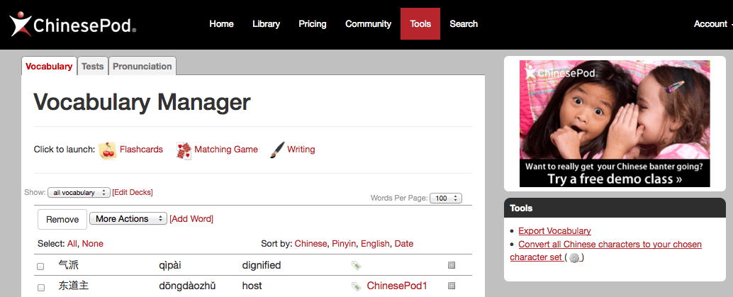 La lista de vocabulario se guarda en la sección de «Tools», una vez en esta página tienes que darle a «Export Vocabulary», que aparece en un recuadro a la derecha de la página, debajo de las niñas que se están contando un secreto.