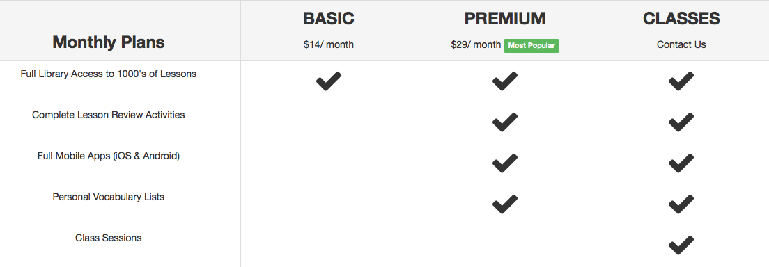 Esta es la lista de precios para suscripciones de un mes. Como puedes ver mi suscripción actual es la Premium ya que puedo acceder a la lista de vocabulario. Quizás el mes que viene me cambie a la suscripción básica.