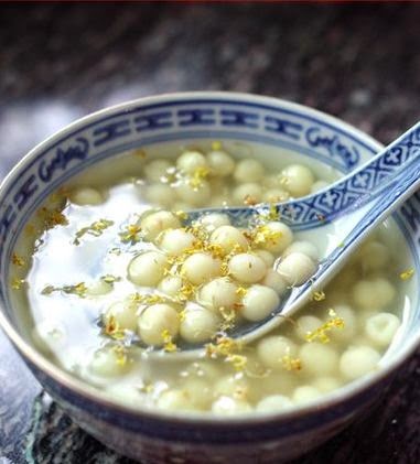 – 鸡头米 jitoumi o arroz de cabeza de pollo: esto sí que no tengo ni la más remota idea de cómo se llama en inglés o en español. Según pone en la wikipedia, son las semillas de una especie de nenúfar gigante. Son redondas y con un piquito, de ahí lo de «cabeza de pollo». Se cocinan en una sopa dulce y tienen una textura firme pero blandita que me encanta. La temporada es alrededor de septiembre.