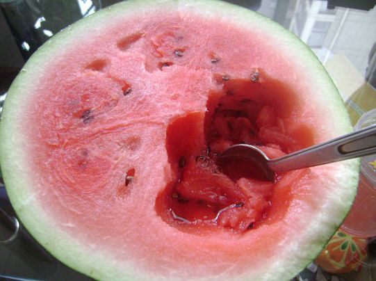La imagen más típica del verano pekinés es un señor mayor con camiseta imperio arremangada (enseñando la barriga) comiendo sandía y abanicándose con un pai-pai de bambú, pero como no he encontrado ninguna foto así pongo esta de la sandia nada más.
