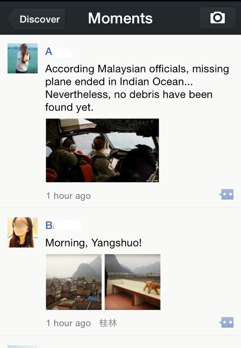 Pues sí, WeChat permite compartir fotos al más puro estilo de Instagram, las puedes editar, agregar filtros y demás. Pero ahí no se queda todo, usando la clásica «@» de Twitter, puedes mencionar a otro usuario de WeChat en tus comentarios. Tus fotos, comentarios, ubicación y «likes» aparecerán en tu página de usuario («Moments») como una especie de Facebook minimalista.