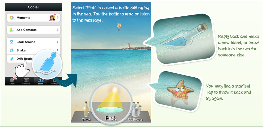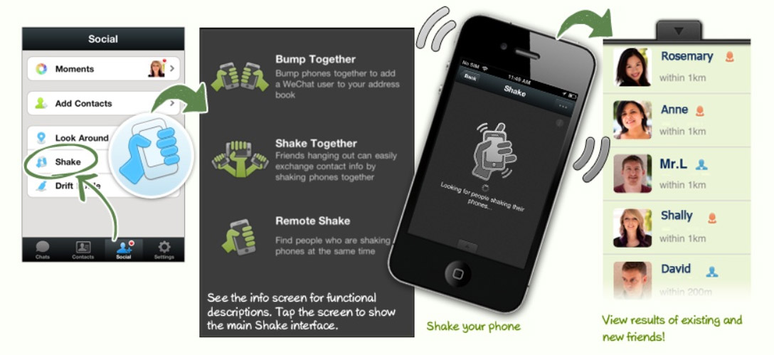 WeChat tiene la opción «shake» (sacude) mediante la cual, una vez puesta tu localización y tu género, la aplicación te ayudará a buscar pareja dentro de tu área. Ahora, si todo lo que quieres es conocer gente nueva sin compromiso, puedes usar la opción «people nearby» (gente en las cercanías) para contactar con aquellos que estén cerca de ti, digamos, para tomar un café después de almuerzo.