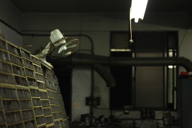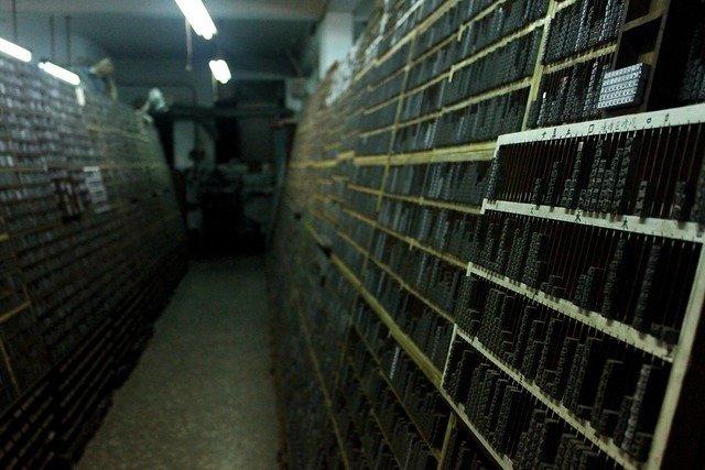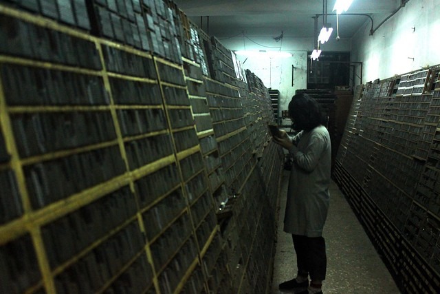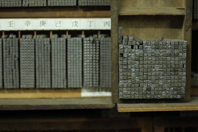 Pese a estar bien escondido, el taller dista mucho de ser un lugar inaccesible, más bien todo lo contrario, tiene las puertas abiertas de par en par, e invita a entrar a todo aquél que quiera. Entrar en el taller del maestro Chang es como volver unas décadas al pasado. Hileras de estanterías ocupan todo el ancho y largo de la planta baja. Las estanterías almacenan incontables columnas de piezas de cobre con infinidad de caracteres, principalmente del chino tradicional (aunque también japoneses, y alfabeto occidental), de varios tamaños y grosores. Hay varios ventiladores repartidos por los pasillos, y un viejo aparato de aire acondicionado, (marca Tatung, como no) de lejos insuficiente para refrescar toda la estancia.