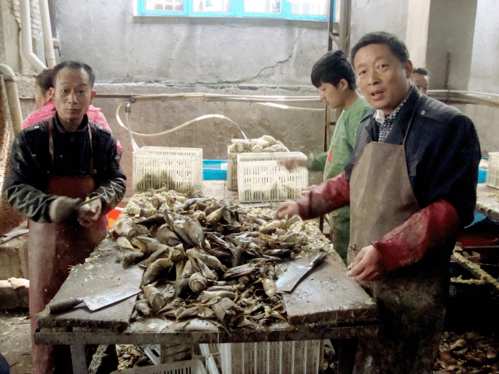 A pesar de que estos pueblitos no existan en el mapa mental de muchos Chinos, puedo asegurar que lo que hay allí es imperdible. Después de pasar días en ciudades donde la gente quiere parecerse un poco más a los extranjeros, caminan ligero sin mirar a quién tienen al lado y se convierten en una arteria más de una comunidad un tanto individualista, ver cómo es la vida en estos lugares es placentero. Los trabajadores de la procesadora de raíces de bambú nos invitaron a entrar al lugar y nos explicaron cómo trabajaban. Tanto mujeres como hombres sonreían las vernos pasar y posaban para las fotos. Después de haber recogido docenas de raíces de bambú se podía ver a las mujeres que cargaban las bolsas al mismo tiempo que reían de algo que ellas mismas comentaban. Y el dueño del pequeño mercado no dudó en hacer una pausa mientras fumaba su cigarrillo para rascar la panza de su pequeño perro negro. Todo esto nos obligó a frenar el paso, sonreír más, agradecer y seguir camino.