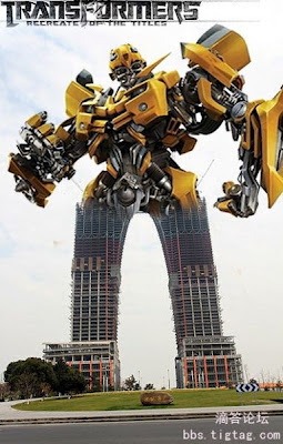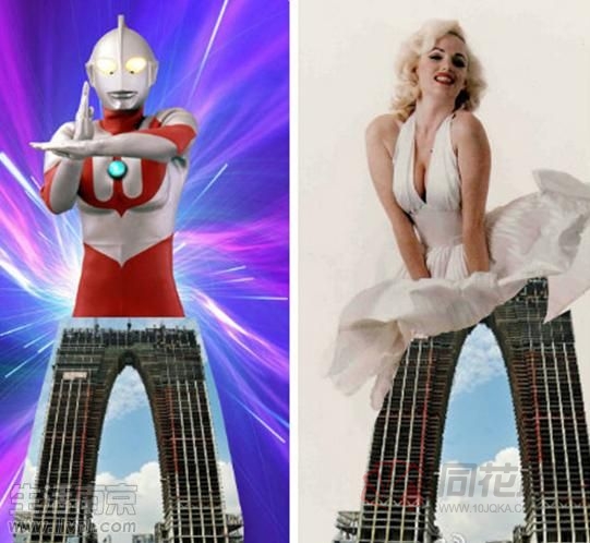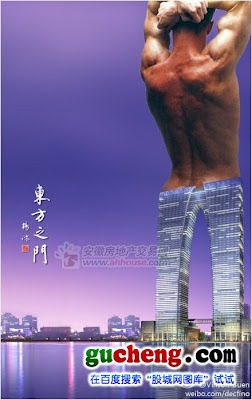 El edificio en cuestión se llama 东方之门, la Puerta de Oriente, y no ha tenido muy buena acogida entre los internautas chinos, que dicen que parece un par de pantalones y que han traído a China el diseño que nadie compró en el extranjero (lo diseñó un estudio de arquitectos británico, si no me equivoco). Y, como los internautas chinos son avispados como ninguno y tienen gran talento para usar el Photoshop, aparecieron montajes como estos: