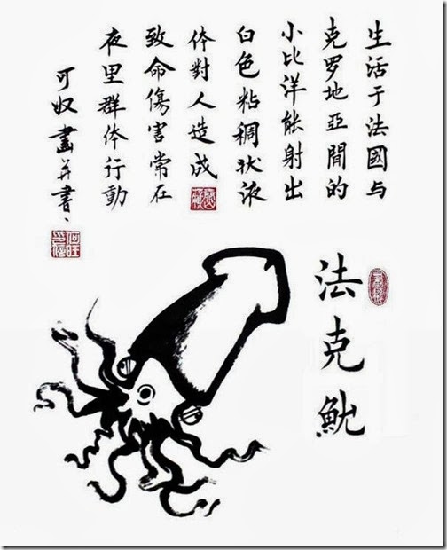 El 法克鱿, Fǎkèyóu es otro animal mitológico, un calamar invertebrado que fue descubierto a la misma vez en Francia y Croacia del que se dice que suelta un líquido blanco cuando se le asusta. Casualmente suena de manera muy similar al «Fuck you» inglés.
