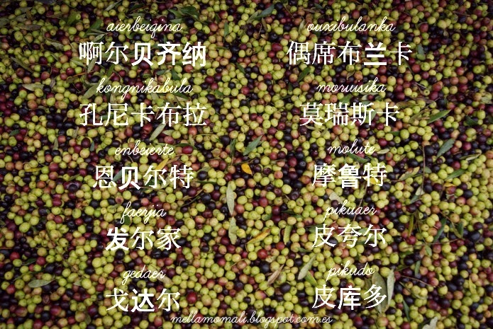 Esta última imagen contiene los nombres de las variedades de aceitunas, no he puesto la traducción ya que el pinyin es la transcripción fonética del español y en la mayoría de los casos son bastante evidentes, ¿te suena el nombre de alguna de estas variedades? (Pondré las respuestas en los comentarios en unos días)