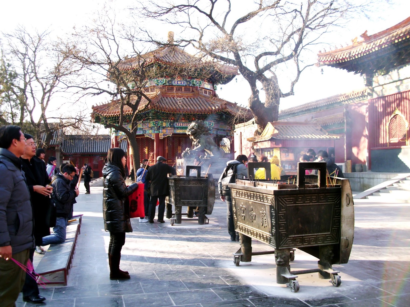 Esta semana voy a compartir con vosotros algunas fotos e impresiones del que posiblemente sea mi lugar favorito de Beijing: 雍和宫 (yōnghégōng), el Templo del Lama. Yonghegong es un templo budista activo, en el que, a pesar de la parafernalia, las tiendas y el bullicio de turistas, podemos presenciar cómo innumerables creyentes peregrinan a sus patios interiores para quemar incienso y hacer sus ofrendas. Sus altos edificios rojos, las estatuas doradas de buda, la música budista de fondo y el aroma del incienso convierten este lugar en un enclave mágico y, para mí, sin par.