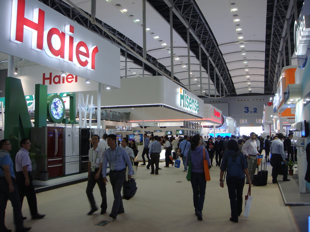 Stand de HAIER en la Feria internacional de electrónica de Cantón, China. Uno de los stand de exposiciones más grandes y visitados en cada edición de la feria siempre es el de Haier. Foto del autor.