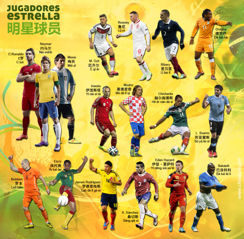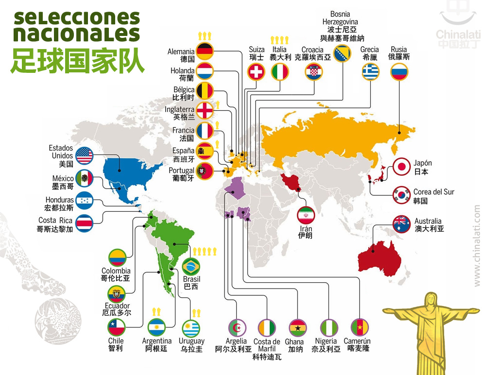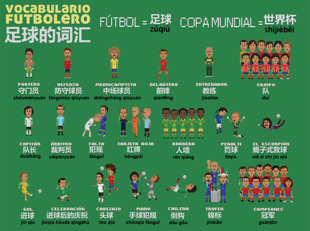 Para los amantes del fútbol que viven en China o que están interesados en aprender mandarín, aquí tienen un infográfico con vocabulario en chino de los países participantes del mundial, algunos jugadores estrella y palabras del mundo «futbolero».