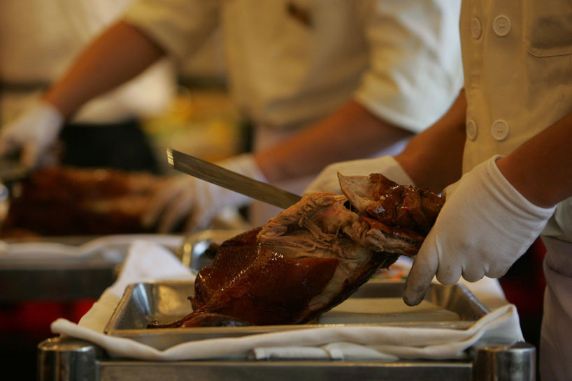 En la cocina abierta a todo tipo de miradas, se puede ver unos patos inflados de un color amarillo brillante, colocados en línea colgando de una estructura de hierro como en reposo. El maestro Chen, cocinero del famoso restaurante Quanjude, especializado en cocinar el más prestigioso pato laqueado de toda China, camina entre los patos con un palo en la mano para cambiarlos de posición de vez en cuando. Al poco tiempo, un pato bien asado sale del horno, presentando un tamaño apropiado, un color amarillento oscuro y sobre todo un aroma irresistible. “Hay que comer el pato cuando aún está caliente”, dice el cocinero. Dicho y hecho, el maestro Chen entra en acción, como si hiciese juegos malabares trincha con rapidez un pato entero. La carne cortada cae en el plato como si fuera nieve y tiene un sabor exquisito. La piel, delicada y crujiente, se derrite en la boca enseguida. Para servir la comida, hay que coger en primer lugar una oblea que se rellena con la piel crujiente, una rebanada de carne asada acompañada de puerros, pepinos o cebolletas y de una salsa especial para tintar el rollito. No cabe ninguna duda de que es un gran lujo por el conjunto de sabores crujientes y deliciosos. Es bien sabido que todos los días los clientes tienen que coger número de espera para comer pato laqueado en este restaurante, al que también acuden numerosos oficiales extranjeros aprovechando el tiempo libre de sus viajes a China.