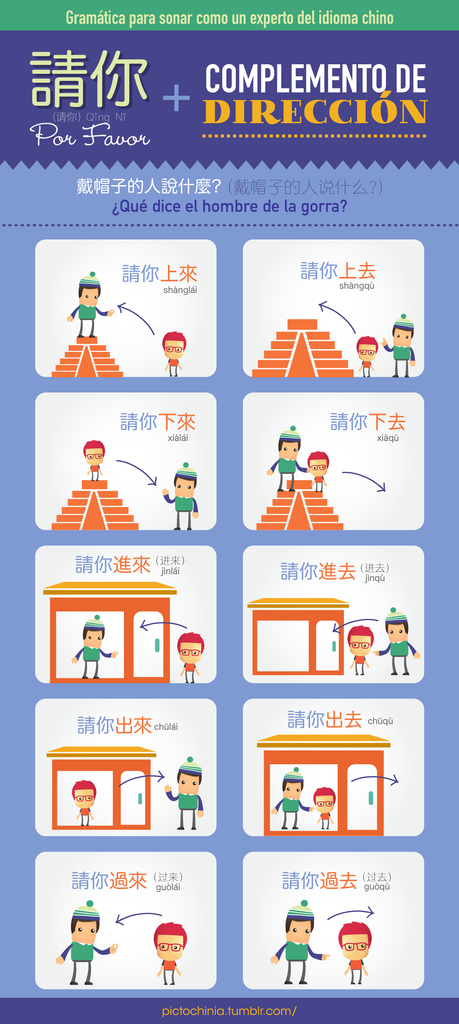Pensando en los actuales y futuros estudiantes de mandarín, he creado esta guía básica de cómo indicarle a alguien que «por favor suba arriba» «baje abajo» «se meta adentro» etc. No es tan complicado como lo escribo, así que no se espanten y 加油!