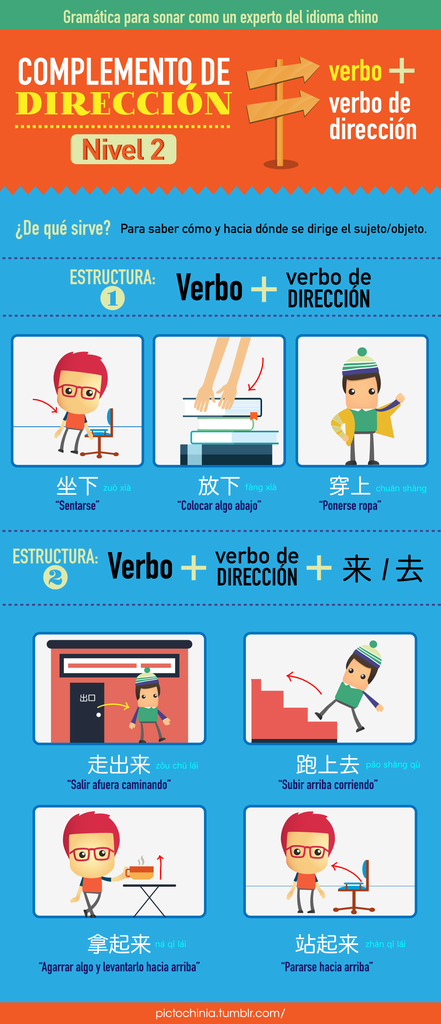 ¿Recuerdan mi infografía sobre«el complemento de dirección»? Una vez que lo han dominado, el siguiente paso (para hablar como un nativo del mandarín) es aprender a acompañar al verbo principal con un verbo de dirección. ¿Es redundante? En español por supuesto que lo es, no es necesario decir «baja caminando abajo» pero en la gramática china, las redundancias están a la orden del día. No desesperen, 加油!
