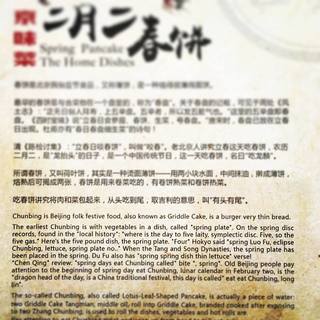 Como contraste a los excesos de las celebraciones de Año Nuevo, en el primer día de la primavera, la gente comía «platos de primavera» (chūn pán 春 盘), con verduras de temporada delicadas, frescas y finamente cortadas. Ya en el siglo III, la gente consumía los chūn pán con verduras picantes como el ajo y el ajo porro, que se comían para purgar la «energía qi de los órganos vitales». En tiempos de la dinastía Han, la palabra ‘bìng 并’ significaba ‘combinar’, en este caso agua y harina. Por lo tanto, la palabra ‘bǐng 饼’ se usaba principalmente para describir ‘brebajes pastosos’ o lo que hoy conocemos como ‘pasta’. Fideos, pasteles de masa, panecillos rellenos, panes fritos, buñuelos en forma de rosquillas, empanadillas, bollos al vapor y panqueques, eran todos formas diferentes de ‘bǐng 饼’. En tiempos de la dinastía Tang (VII-X), los panqueques de primavera ya habían hecho su aparición y se comían como envoltorios para otros platos*.