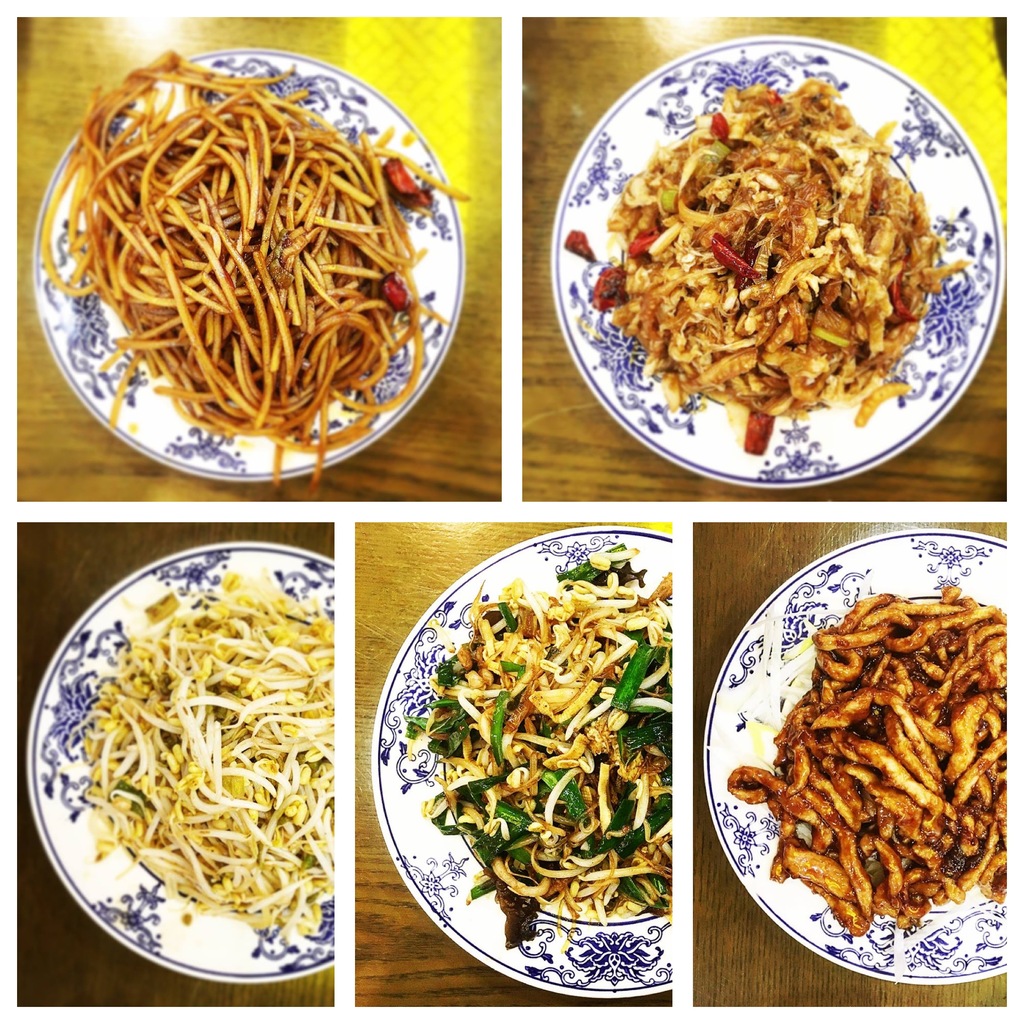 Estoy disfrutando de todo, pero dos platos no permiten que mis palillos se alejen. Ambos tienen un ingrediente agrio: los delicados fideos de alubias mung con col encurtida y las papas ralladas. Con cada bocado del primero estoy saboreando los reconfortantes (aunque predecibles) sabores de la comida salteada y de los ingredientes chinos, pero entre ellos, aparecen las notas polacas del chucrut, y me confortan… y de que manera. El segundo, sin dudas mi favorito, es la mejor versión de este plato que he podido encontrar en China hasta la fecha. Las papas ralladas no tienen una tonalidad clara y pálida -como usualmente, sino están maravillosamente sombreadas con un vinagre marrón oscuro. Les da un sabor más complejo que es a su vez complementado por el picante de los chiles secos. Y su textura es perfectamente crujiente. Estoy pensando que por este plato vale la pena volver al restaurante.