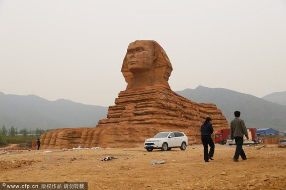 En el tema de las réplicas e imitaciones China siempre ha sido una de las pioneras con respecto al resto del mundo, pero esta vez su atrevimiento parece haber causado un gran revuelo. Se trata, ni más ni menos, de una réplica a tamaño real (60 x 20 metros) de la famosa Esfinge de Guiza de Egipto. Se terminó de construir el pasado mes de abril y se encuentra en el pueblo de Donggou, a las afueras de la ciudad de Shijiazhuang, capital de la provincia de Hebei (norte de China).