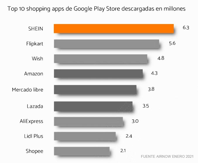Shein es ahora la empresa de comercio electrónico de moda rápida transfronteriza más grande de China . La marca de ropa de comercio electrónico llega a los consumidores en los Estados Unidos, Francia, Rusia, Alemania y más de 200 países. Según Airnow Data , en 2021 la aplicación móvil de Shein superó los 7 millones de usuarios activos mensuales solo en los EE. UU. Según Jing Daily, en TikTok, el hashtag #Shein ha obtenido más de 6200 millones de visitas. Lo que convierte la estrategia de mercado de Shein en todo un éxito.