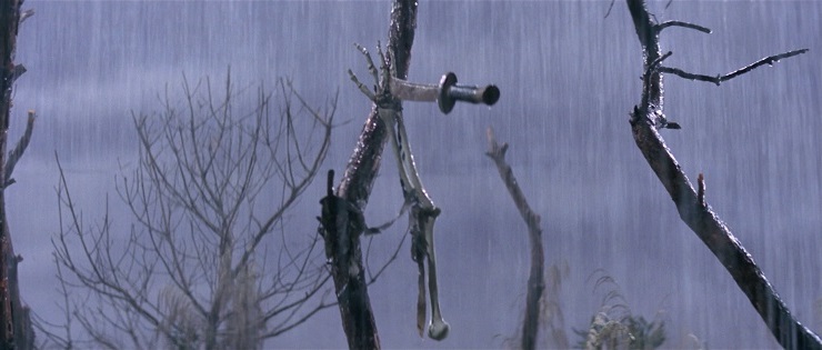Como comentaba anteriormente, el principal atractivo de la película, reside en que nuestra estrella, el caballero Lei Li (David Chiang) ve como su cuerpo y su brazo derecho son separados para optar caminos diferentes, quedando éste lisiado, y prácticamente inservible para la lucha. Os preguntaréis sobre la técnica utilizada para hacer que un actor con dos brazos, apareciera ante el espectador, aparentemente con uno sólo. ¿Dónde lo escondía? Siento comunicaros que la respuesta es simple a la par que vulgar, ya que el bueno de David Chiang escondía su brazo derecho encogido, dentro de la vestimenta. Una vestimenta, que cambiaba de color según el estado de ánimo del personaje, alternando entre el negro y un blanco impoluto, que simboliza la pureza del héroe, hábilmente escogido para su resurgimiento cual ave fénix, y dispuesto a mancharse con la sangre de los enemigos. Enemigos de entre los cuales destaca el principal villano. Un barbudo sinvergüenza, de nombre impronunciable, con más maldad que el gato de la Cenicienta (Lucifer) , y además, surtido de una nueva y habilidosa arma letal, el nunchacku de tres secciones capaz de acabar con dos espadas gemelas, y que representaba una nueva oportunidad, para que los pequeños de la casa pusieran en práctica sus habilidades bricomaniacas, en el campo de la carpintería.