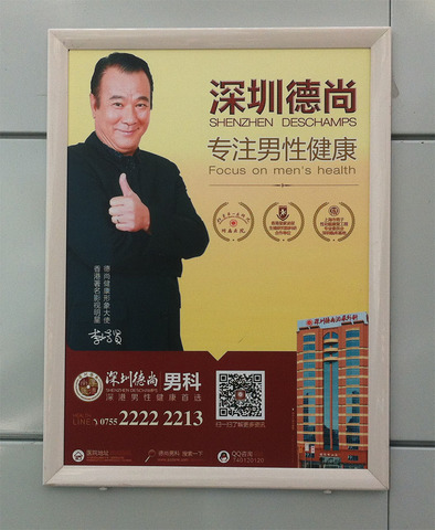 Si pudieses hablar con el anuncio, ese señor te diría “¿Hospital para hombres? Yo soy un hombre, ¿ves este gesto de mi mano, no? Significa que este hospital tiene mi aprobación absoluta. ¿Eres hombre y necesitas un hospital? A qué demonios estás esperando. Ven aquí, te van a cuidar bien, te lo prometo. ¿No ves mi cara de felicidad? ¿No te fías de un actor? Deja de remolonear, hombre. Pon tu salud en buenas manos. Ven al Hospital Shenzhen Deschamps”.