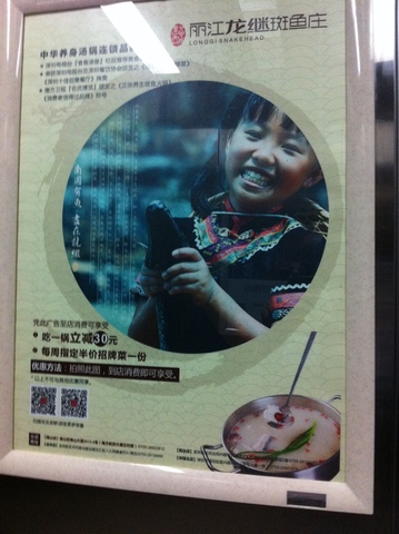 Éste es uno de mis favoritos. Me lo encontré en el ascensor de mi casa. Se trata de un restaurante que ofrece comida de Lijiang (Yunnan) y su especialidad es el hotpot de 龙继斑鱼… un pescado de río bastante feo.