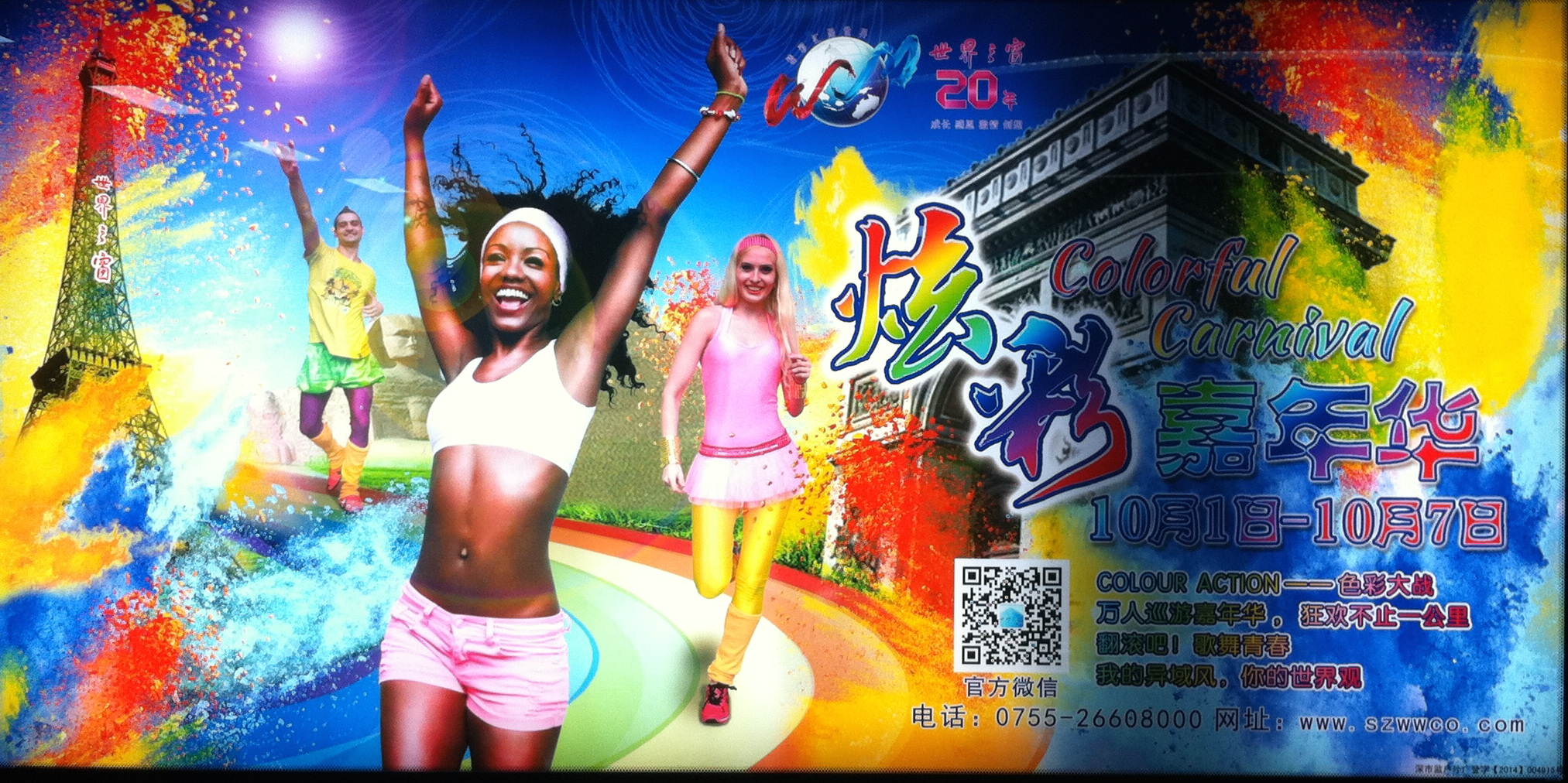Una suerte de color run cutre celebrada en Windows of the world, un parque de Shenzhen donde han recreado monumentos de todo el planeta. De ahí que hayan colado la Torre Eiffel y el Arco del Triunfo.