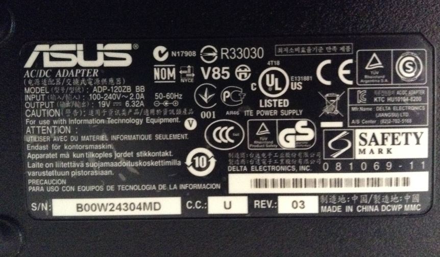 La imagen muestra un transformador de laptop adquirido en China que cumple con la mayoria de las certificaciones internacionales vigentes al día de hoy, entre ellas la CCC. Cada certificación significa que el aparato es seguro para su explotación en las regiones y países en que aplique cada certificado. Este tipo de componente o accesorio es un excelente ejemplo para conocer la cantidad de certificaciones vigentes, en las que todas se diferencian entre si.