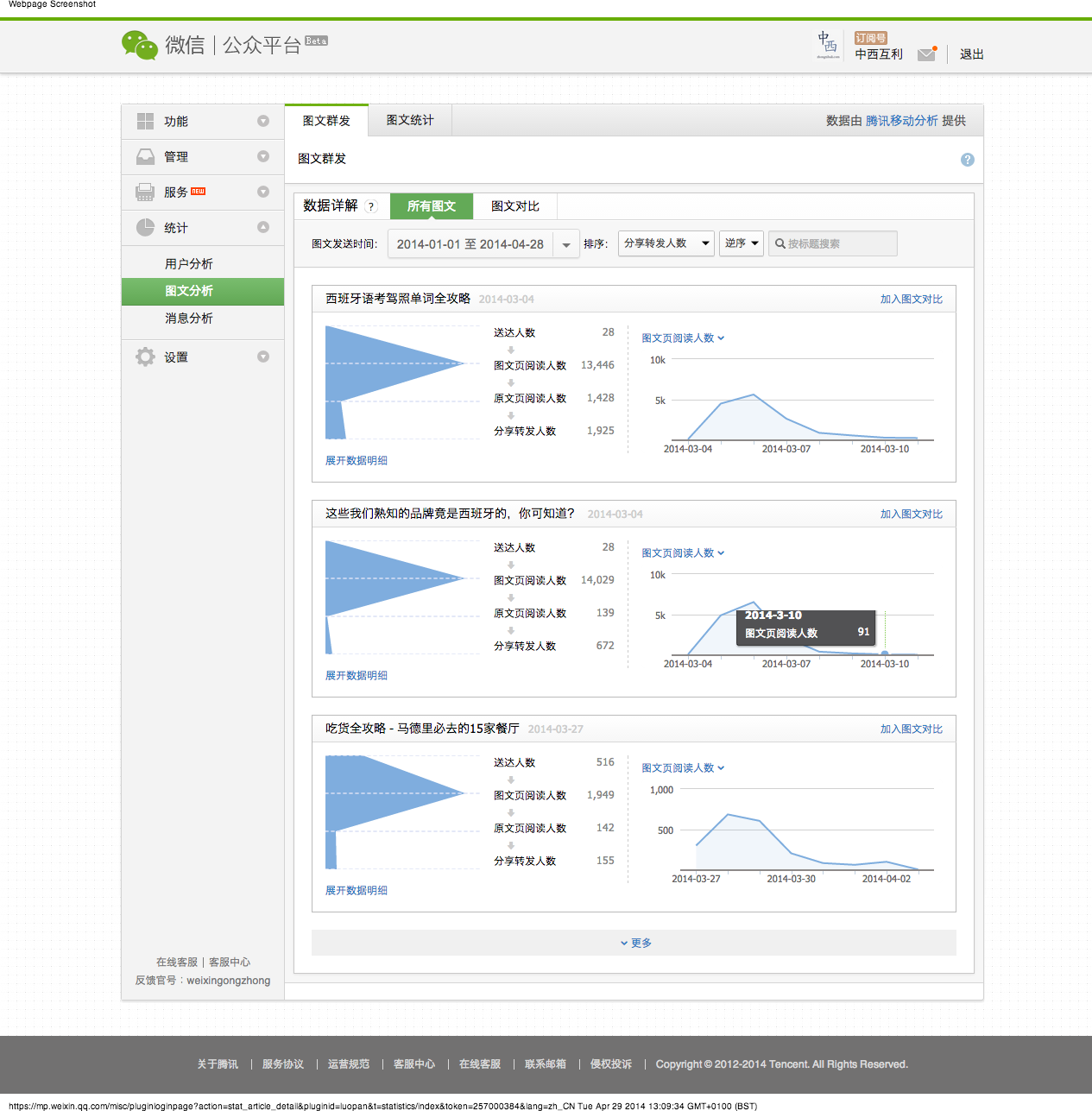 10) El panel de estadísticas de WeChat es extraordinario. Vienen datos muy completos del performance y engagement de cada post, en cada día, por lo que puedes monitorizar muy bien el progreso y optimizar el trabajo en el canal.