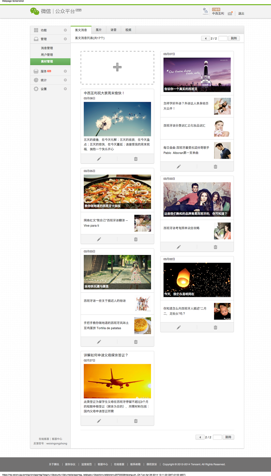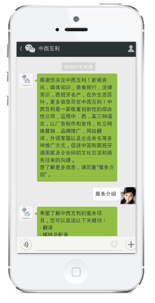 12) Funciones específicas para la atención al cliente o relación con el seguidor. Por ejemplo, puedes enviar mensajes automáticos cuando alguien te sigue, y establecer unas keywords para que, automáticamente, reciban más información sobre las preguntas frecuentes. Así, si sigues nuestra cuenta de WeChat, 中西互利 (aixibanya), te aparece un mensaje de presentación que, además, indica: si quieres saber más, escribe 服务介绍 (presentación de servicios), y automáticamente llega un listado de nuestros servicios. Después puedes escribir “traducción” o “publicidad”, y sale la presentación de cada servicio específico. Cada marca puede utilizar estas herramientas de una forma muy flexible. Esto ayuda mucho a tener seguidores informados, y ahorra muchísimo coste de gestión de peticiones, entre otras ventajas.