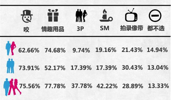 En el lado de los hombres, observamos que la modalidad más aceptada es la del sexo oral, con un 86,42% de apoyo, seguida del uso de juguetes (82,1%), la grabación de los actos en vídeo (33,95%), el sadomasoquismo (28,4%) y los tríos (19,14%). En el lado de las mujeres, las preferencias cambian en favor de los juguetes eróticos (67,29%), el sexo oral (48,6%), el sadomasoquismo (16,82%), la grabación en vídeo (14,49%) y los tríos (9,35%).