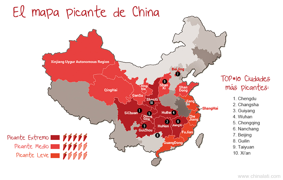 A continuación se muestra el mapa de China, con las provincias y ciudades más picantes.