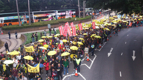Miles de personas han tomado hoy las calles del centro de Hong Kong para exigir democracia y sufragio universal en la primera manifestación después de que a finales del año pasado se ocupara parte del distrito financiero de la ciudad durante tres meses con el mismo fin.