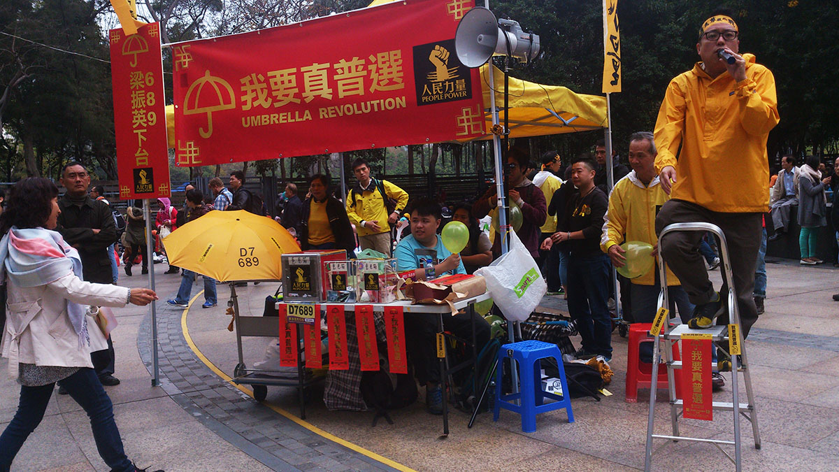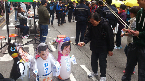 La mayoría de ellos portaba algo de color negro y amarillo, como manda el protocolo del Movimiento de los Paraguas, dándole una nota de color a una manifestación en la que el cartel reinante era uno que insultaba al jefe de Gobierno con un juego de palabras en cantonés y números, y que venía a ser «que le j**** a C.Y. Leung».