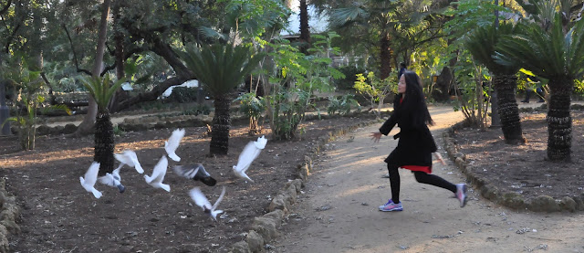 Por otro lado, ella ha disfrutado mucho con unos animalillos que frecuentemente suelen ser repudiados por la mayor parte de la población, nuestras palomas, que invaden nuestras plazas y defecan en nuestro mobiliario urbano y cabezas. Cada vez que veía un grupúsculo de estas aves, arrullando al solecillo, le salía una sonrisa ante mi atónita expresión.