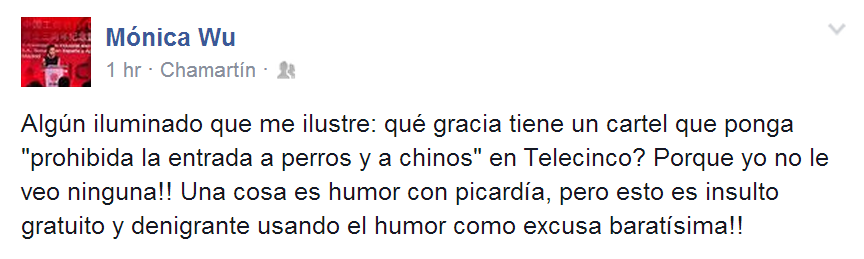 Os aseguro que no exagero lo más mínimo cuando digo que estas cosas me parten el corazón. Porque después tengo que decirle a mi novia (china), a mis amigos (chinos), a mis socios (chinos), y a todas las personas chinas con las que hablo todos los días, que no todos los españoles somos así, que la mayoría no tenemos ningún problema con ellos, que esa cadena de televisión muchas veces es percibida como falta de escrúpulos y que muchos españoles desprecian su programación. Me dicen que lo saben, pero que no importa, porque les duele, y porque saben que muchos chinos cuando se enteran de estos sucesos reaccionan con odio de vuelta.