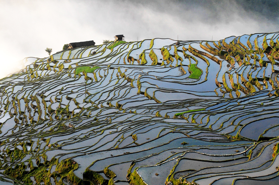 La mejor temporada para contemplar los campos escalonados de Yuanyang es de noviembre a abril, pues durante esta época están inundados de agua, por lo que parecen tener una capa transparente. Forman un paisaje magnífico entre luces y sombras similares a la superficie de un espejo pulido. Si visitas el lugar durante la Fiesta de la Primavera, puedes ver el paisaje dentro de un mar de nubes; mientras que si vas cuando celebran la Fiesta de los Faroles, puedes ver toda la montaña cubierta de árboles verdes y flores multicolores. Uno de los mejores lugares que se suele visitar a primera hora de la mañana se llama el árbol Duoyi. El sol recién nacido dispersa la niebla matinal cubriendo las terrazas con una capa de luces doradas. Los pueblos de las nacionalidades yi y hani, situados entre las nubes y la niebla son tan hermosos y pintorescos que parecen un sueño irreal y un paraíso místico. Por su parte, la zona llamada La boca del tigre es el mejor destino para contemplar la puesta de sol, justo cuando los continuos campos escalonados parecen un abigarrado mar ondulante con las luces del sol reflejándose en su superficie.