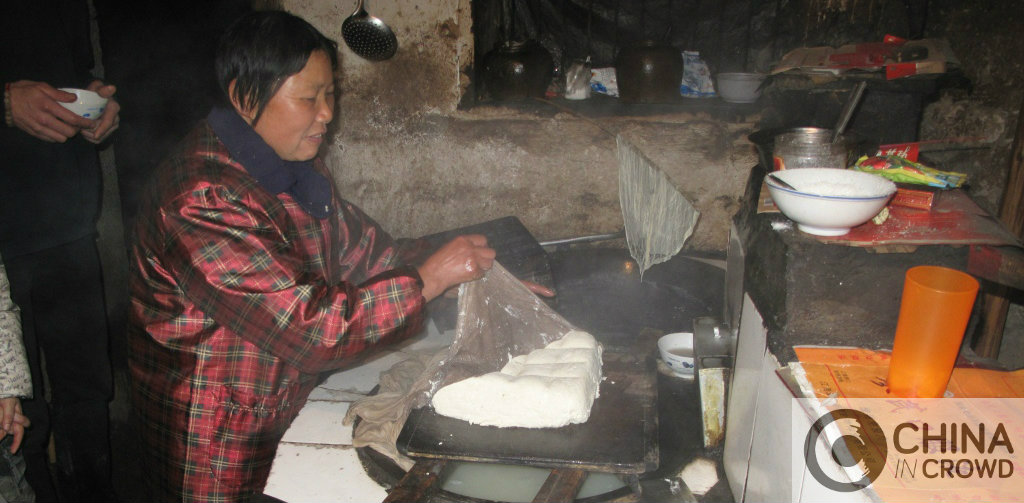 Como estuvo chispeando, al llegar encendimos una pequeña hoguera para secarnos y entrar en calor. Al rato los aldeanos nos deleitaron con un taller de tofu tradicional. Fue un auténtico espectáculo ver cómo lo elaboraban de forma artesanal, y he de decir que no soy un amante del tofu, pero este estaba realmente delicioso.
