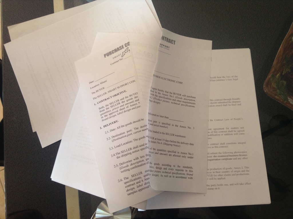 En la mayoría de las relaciones con pequeños y medianos fabricantes donde trabajamos marcas OEM, el contrato prácticamente no tiene valor para el productor y su primera intención será obviarlo. Tú haces el deposito, ellos producen la mercancía, tu pagas y ellos te la envían. Así de sencillo. Pero en la práctica necesitas proteger tu producto de algunas eventualidades por lo que aprovecha y pon tu el contrato con tus condiciones. Foto del autor.