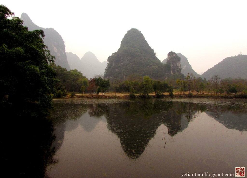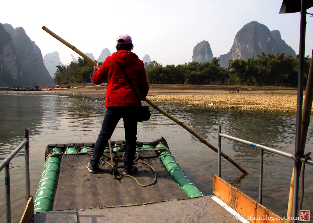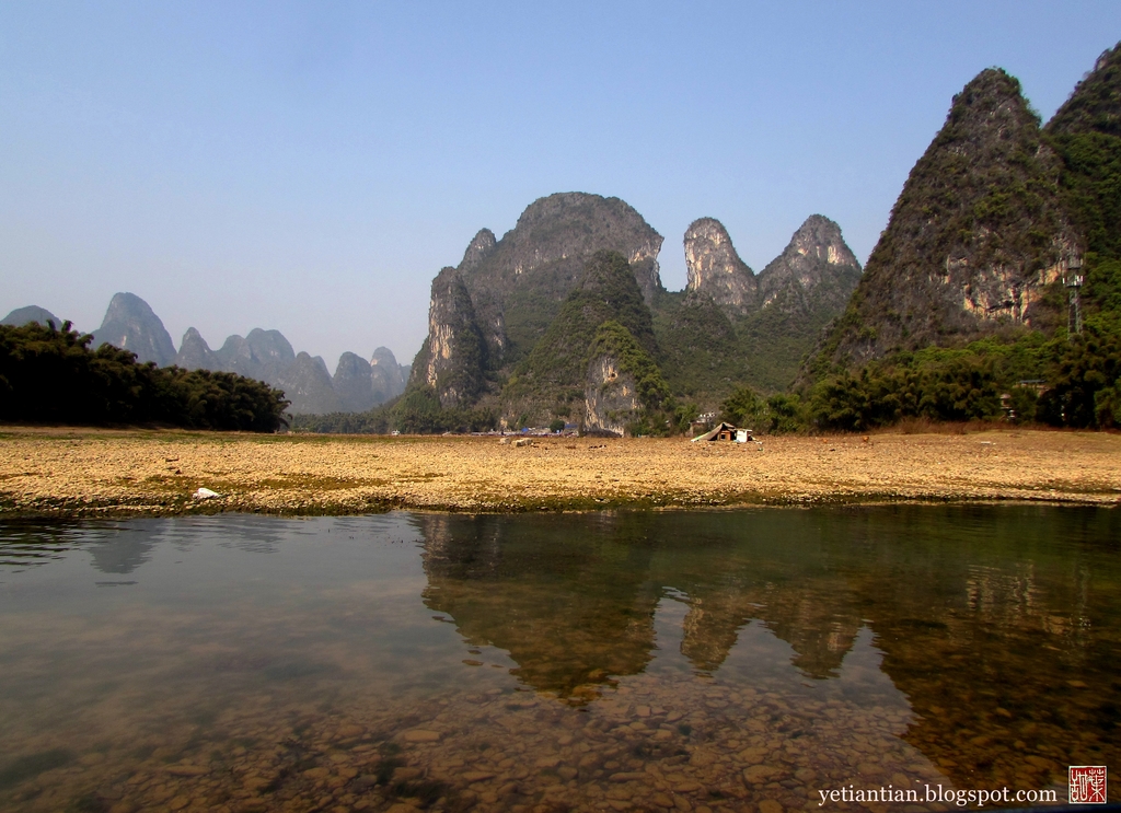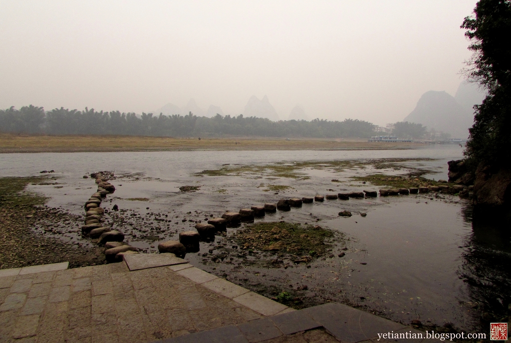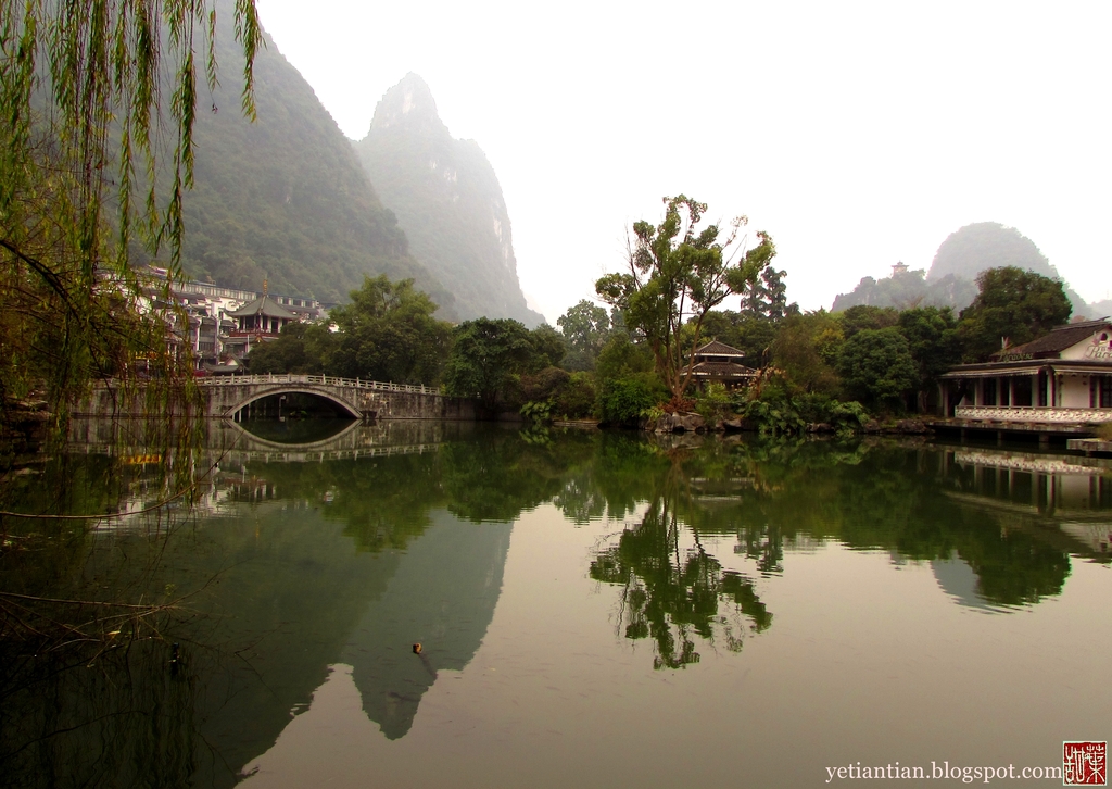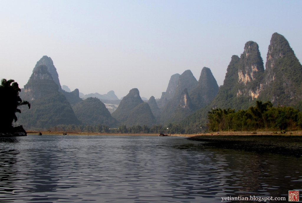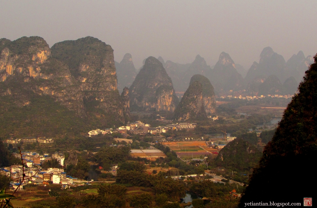 Yangshuo es un pueblo situado en la región de Guilin (al sur de esta ciudad), en la provincia de Guanxi. Todo libro fotográfico sobre China incluye imágenes del precioso paisaje de esta zona, por lo que Guilin es uno de los lugares de este país más conocidos por el extranjero. «Me voy a Guilin», decía a amigos y familiares antes del viaje, y ellos me respondían: «¿Donde las montañas picuditas?» Cuando llegué a Yangshuo, miré a mi alrededor, me vi rodeada por aquel paisaje kárstico y no pude evitar pensar que aquello era como estar dentro de la boca de un tiburón, rodeado por sus hileras de dientes.