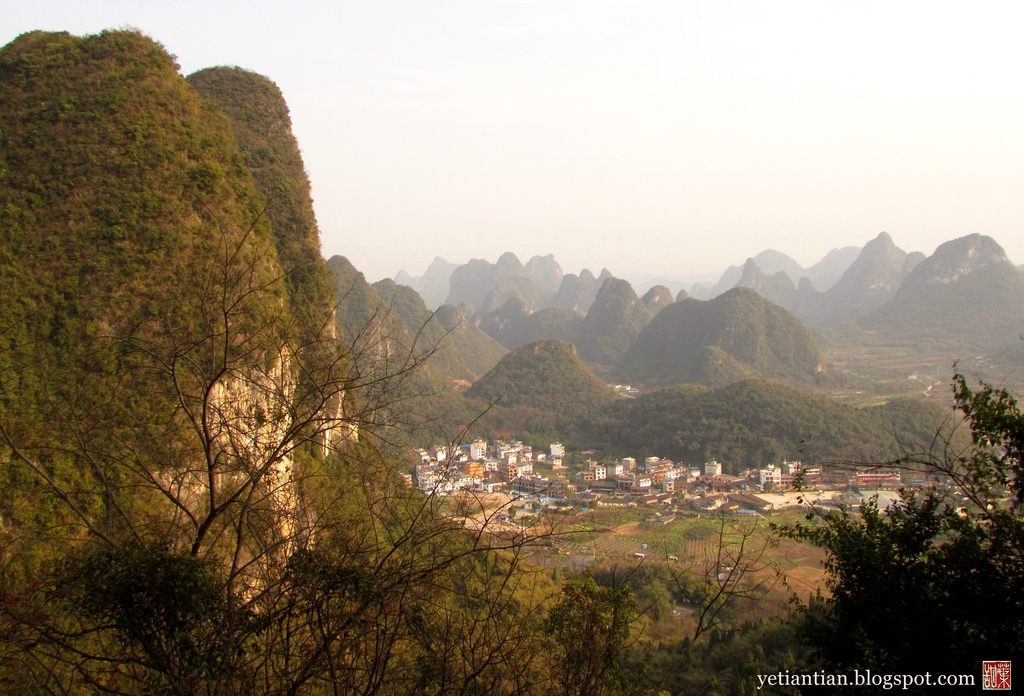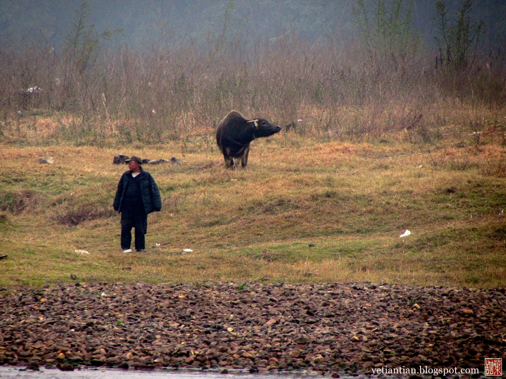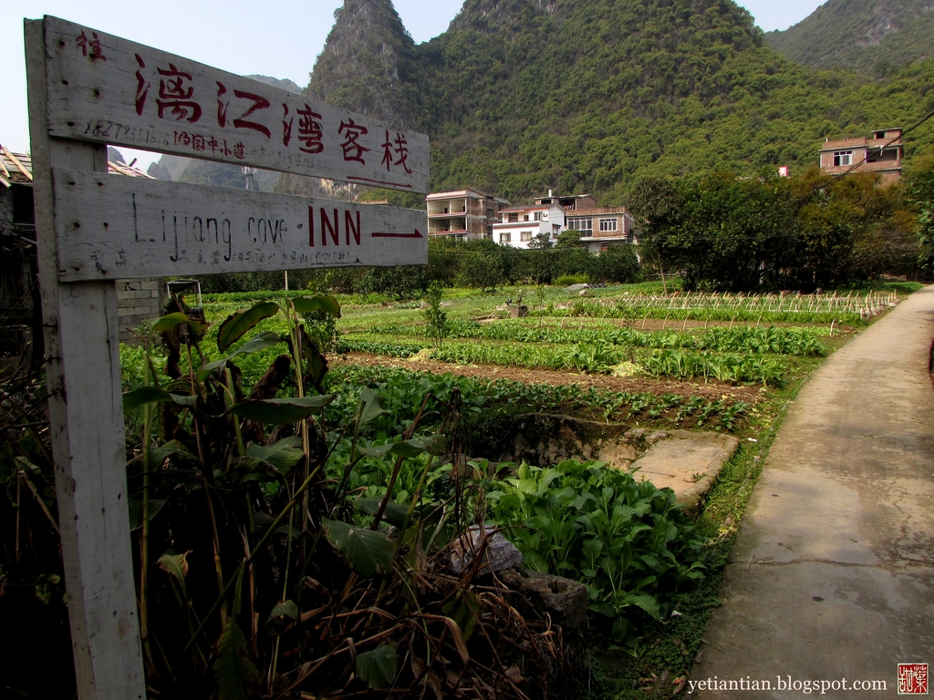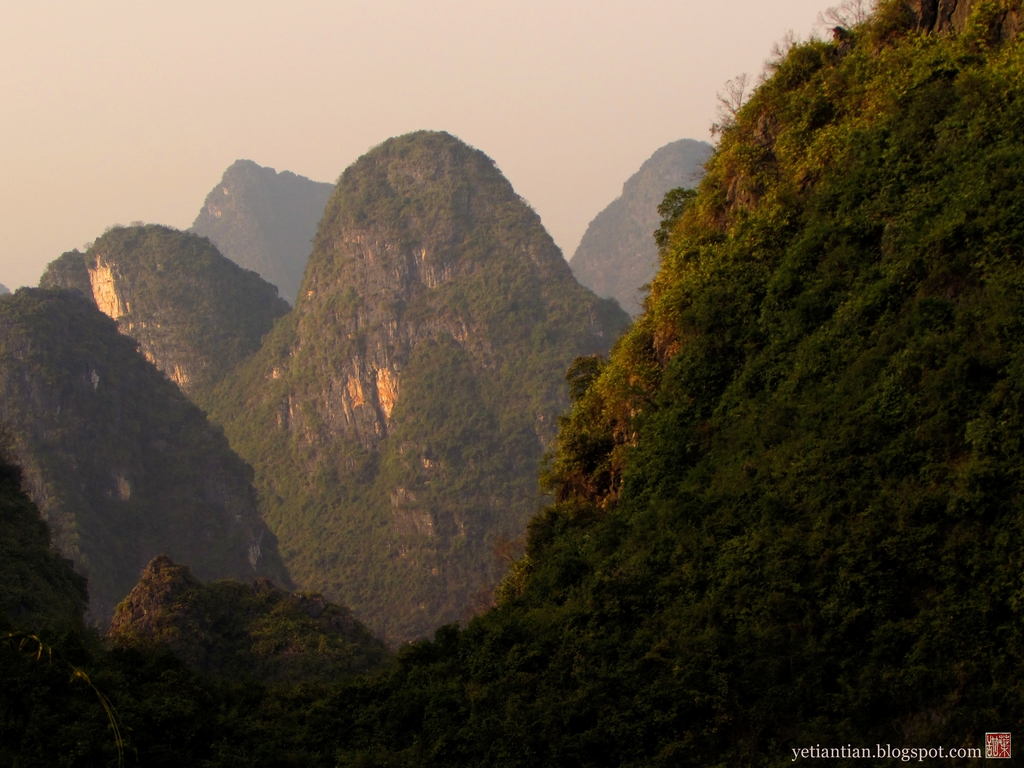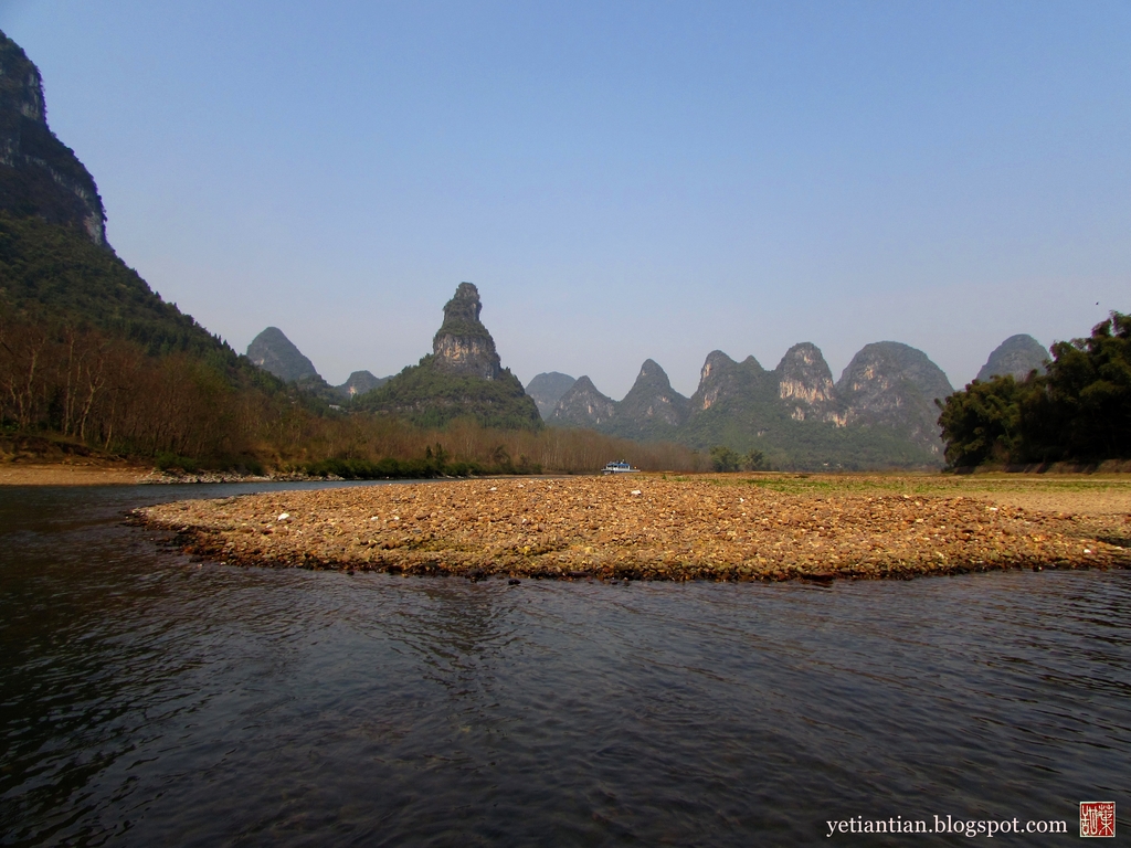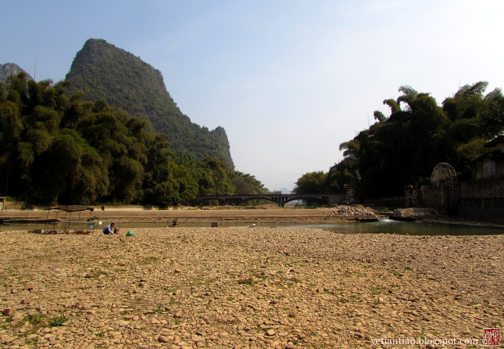 Yangshuo es un pueblo situado en la región de Guilin (al sur de esta ciudad), en la provincia de Guanxi. Todo libro fotográfico sobre China incluye imágenes del precioso paisaje de esta zona, por lo que Guilin es uno de los lugares de este país más conocidos por el extranjero. «Me voy a Guilin», decía a amigos y familiares antes del viaje, y ellos me respondían: «¿Donde las montañas picuditas?» Cuando llegué a Yangshuo, miré a mi alrededor, me vi rodeada por aquel paisaje kárstico y no pude evitar pensar que aquello era como estar dentro de la boca de un tiburón, rodeado por sus hileras de dientes.