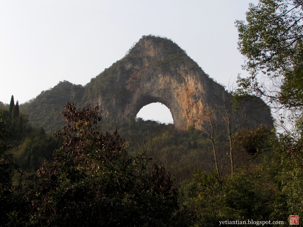 Y por último fuimos hasta otro de los puntos que uno no puede perderse: la Colina de la Luna. Para los vagos, como yo, cuesta un poco llegar arriba, pero el pequeño esfuerzo merece la pena (¡gimnasio gratis por el módico precio de 15 yuan!). Como el propio nombre indica, es una colina acabada en un arco natural perfecto desde donde se tienen unas vistas preciosas de la zona. Una forma estupenda de dar un «adiós» a Yangshuo o, al menos, de darle un «hasta la próxima».